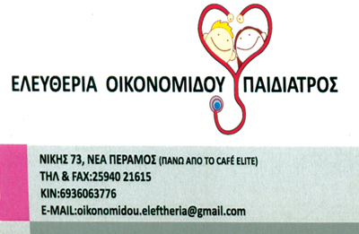 Δέχεται καθημερινά πρωί - απόγευμα (εκτός Τετάρτης απογεύματος)Η παιδίατρος Οικονομίδου Ελευθερία διατηρεί ιδιωτικό γραφείο στην Καβάλα, στην οδό Νίκης 73, στη Νέα Πέραμο.Παρέχει ολοκληρωμένη ιατρική περίθαλψη σε παιδιά κάθε ηλικίας.Στο ιατρείο της παιδιάτρου, σε ένα υποστηρικτικό και φιλικό περιβάλλον, πραγματοποιούνται όλες οι ανάγκες των παιδιών και των γονέων σε θέματα πρόληψης, ενημέρωσης, εμβολιασμών, διατροφής, ψυχοκινητικής υγείας, οξέων και χρόνιων παθήσεων.
