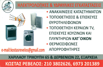 Αναλαμβάνουμε υδραυλικές εγκαταστάσεις, εγκατάσταση θερμοσίφωνα, εγκατάσταση μπόιλερ,αποφράξεις αποχετεύσεων, εγκατάσταση φυσικού αερίου, ηλεκτρολογικές εγκαταστάσεις,επισκευές κουζίνας, επισκευές πλυντηρίου, επισκευή απορροφητήρα.