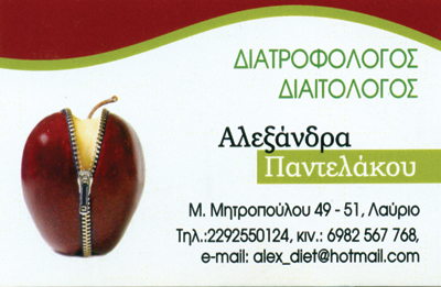 Επί σειρά ετών η Διαιτολόγος Διατροφολόγος Παντελάκου Αλεξάνδρα βοηθά όποιον απευθυνθεί σε αυτήν. Εξυπηρετεί εδώ και χρόνια όλη την πόλη του Λαυρίου κάνοντας αξιολόγηση του ατόμου, έλεγχο βάρους, καταπολέμηση διατροφικών διαταραχών και έλεγχο διατροφής για ιατρικούς λόγους.