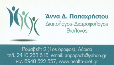 Η κυρία ΠΑΠΑΧΡΗΣΤΟΥ ΑΝΝΑ είναι βιολόγος (Πανεπιστήμιο Ιωαννίνων) και διατροφολόγος - διαιτολόγος (ΤΕΙ Θεσσαλίας) στη Λάρισα.