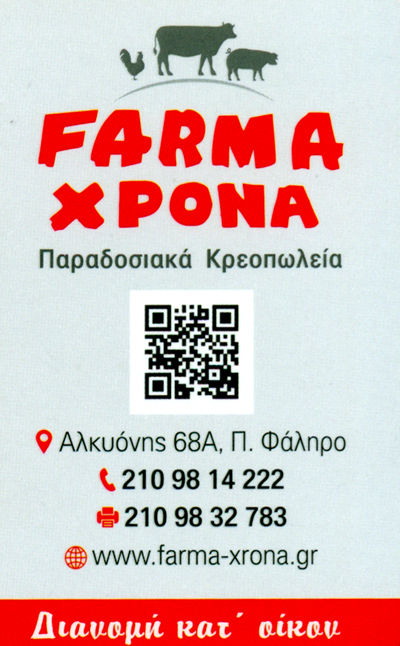 Με εξειδικευμένο προσωπικό, γνώση και διαρκή εξέλιξη στις μοντέρνες κοπές κρέατος,πιστοποιημένο εξοπλισμό και κυρίως το εξαιρετικής ποιότητας προϊόν που διαθέτει η FARMA ΧΡΟΝΑέχει καταφέρει να αποτελεί σημείο αναφοράς καλού φαγητού των νοτίων προαστίων αλλά και ολόκληρης της Αττικής.